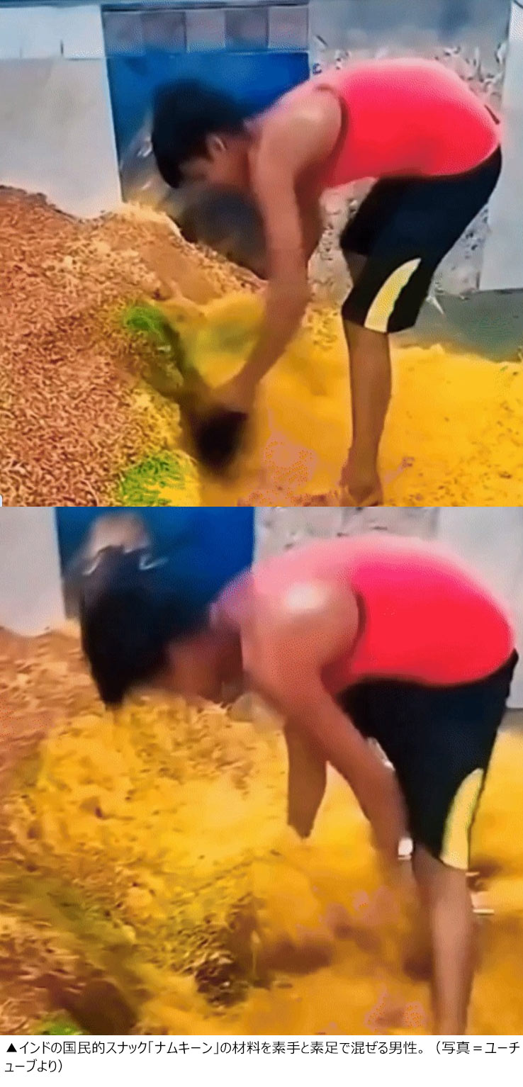 最近、ユーチューブチャンネル「imran Ali」には、腰をかがめたインドの男性が、玉のような汗をかきながら食べ物の材料を素手と素足でかき混ぜる様子を収めた動画がアップされた。この食べ物は、インドの伝統的スナック「ナムキ..