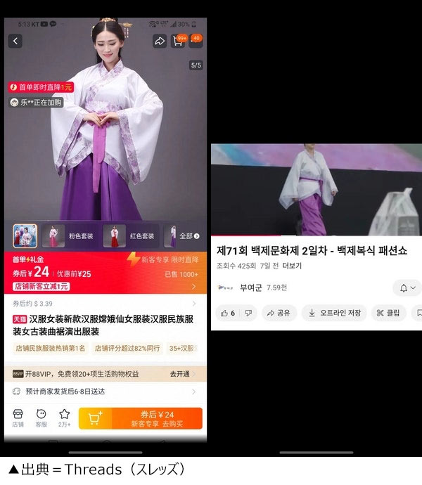 騒動の発端は、SNS(交流サイト)に「扶余で開催されている百済文化祭の動画を見たんだけど、百済服飾ファッションショーの衣装を見ていたら、どう見ても変なので、中国の通販サイトでその衣装を探してみたところ、中国のコスプレ衣装にそっくりでショ..