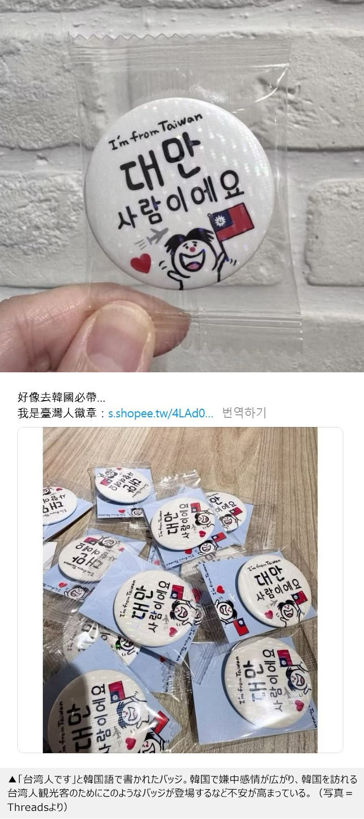 SNS(交流サイト)のThreads(スレッズ)には10日、ある台湾人から「最近、韓国では中国人に対する反感がある。こういうバッジを着けるべきかな?」と写真付きの投稿があった。