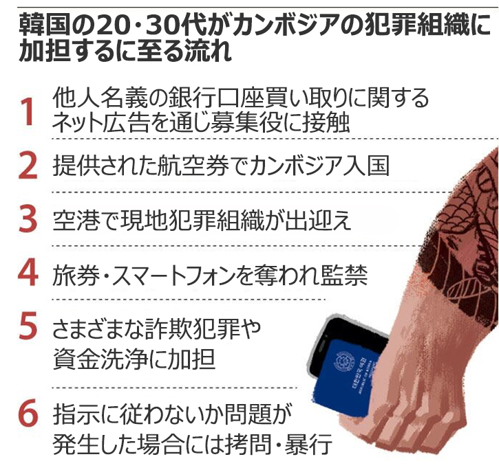 カンボジアにある中国系犯罪組織が韓国人20・30代を誘い込むのは、犯罪収益をロンダリングするための他人名義の銀行口座が必要だからだ。韓国国内の仮想資産取引所にリンクした銀行口座は通常1000万~2000万ウォンで取引される。口座を貸せば、ロンダリング資金の1~3%を手数料として払うとうたい、資金が必要な若者を誘惑する。広告を見て接触してきた人物はロンダリング資金の引き出しを防ぐために人質にされ、詐欺犯罪に加担させられる。