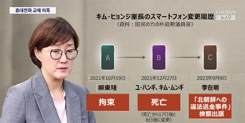 キム・ヒョンジ室長は李大統領が北朝鮮への違法送金事件疑惑と関連して水原地検に出頭し、取り調べを受けた2023年9月9日にもスマートフォンを変えたとのことだ。当時は李華泳(イ・ファヨン)元京畿道平和副知事が李大統領の北朝鮮への違法送金事件疑惑について認める趣旨の供述をしていた時だ。