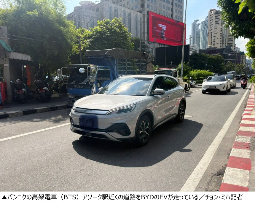 10月半ば、タイ・バンコクの高架電車(BTS)アソーク駅近くの交差点で約10分間、同じ車線を通った自動車100台余りを調べたところ、日本車が大半を占めたが、その次に多かったのが中国の電気自動車(EV)メーカー、BYD(比亜迪)の車両だった。タイの自動車市場は長年日本車が掌握してきたが、最近は中国車の存在感が高まっている。