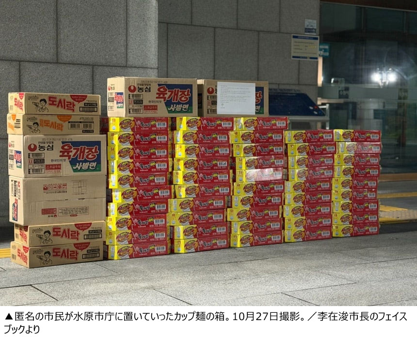 水原市が10月28日、明らかにした。それによると、10月27日の夜に「水原・光教の住民」を名乗る人物が、カップ麺56箱を水原市庁の本館正門前に置いていったという。