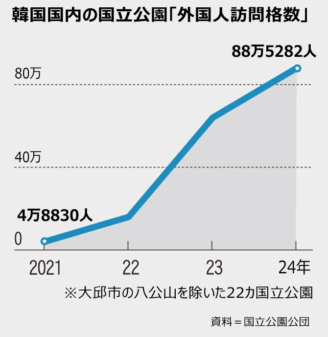 国立公園公団によると、八公山を除く全国22の国立公園を訪れた外国人訪問客は2021年の4万8830人から昨年は88万5282人へと、3年間で約18倍に増えた。同期間、韓国人訪問客は3590万人から4065万人へと約13%増えているが、これを大きく上回るものだ。彼らが最も多く訪れたのは、昨年基準で慶州国立公園(41万5427人)、雪岳山(20万3337人)、漢拏山(12万9705人)、北漢山(5万637人)などだった。