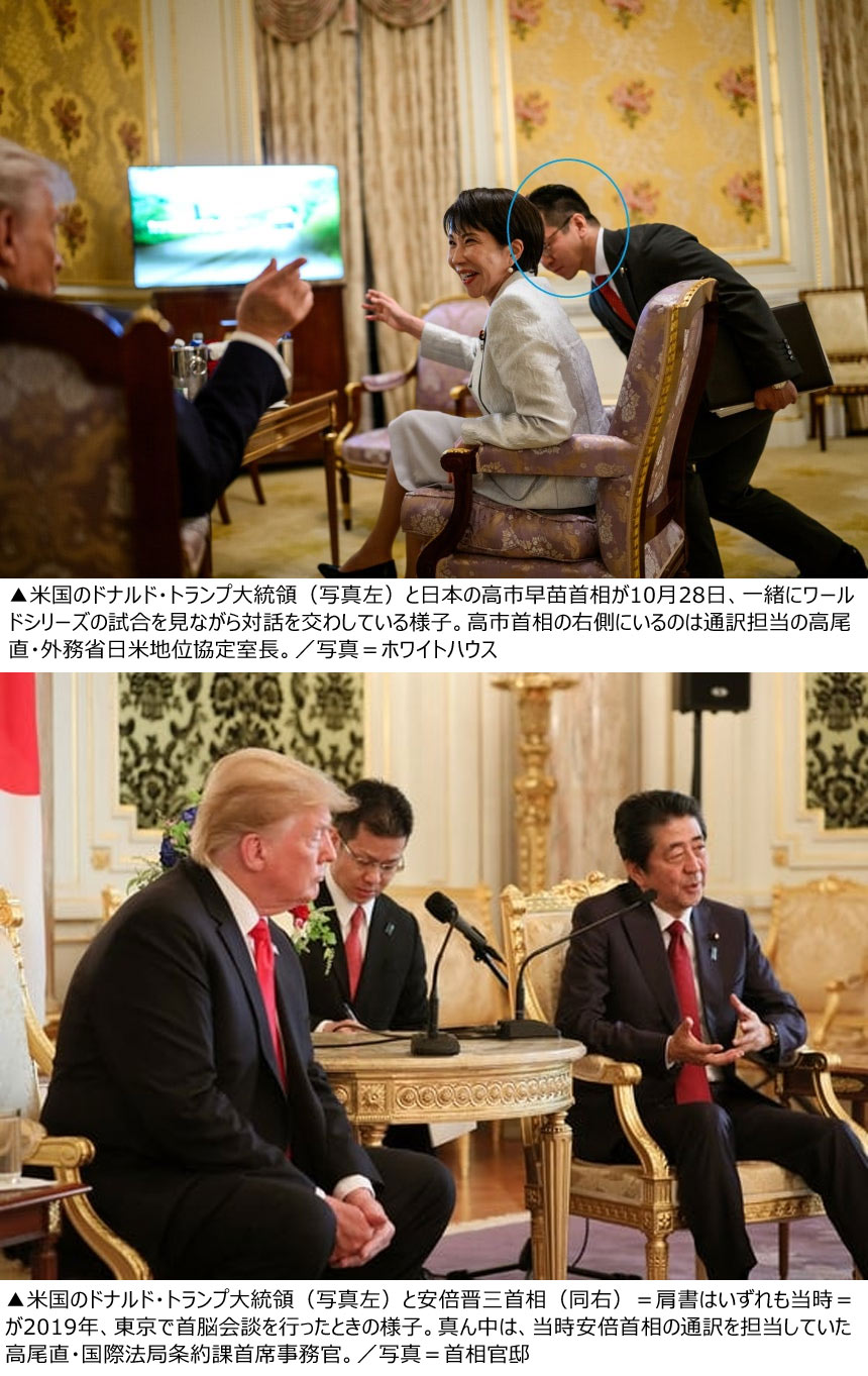 米国のドナルド・トランプ大統領が再び政権を取った後、最初に日本を訪問し、10月28日に高市早苗首相と首脳会談を行って「米日同盟の黄金時代が到来した」と宣言する中、この日の会談では見慣れぬ顔がカメラに捉えられ続けた。高市首相に密着して通訳を担当した高尾直・外務省日米地位協定室長だ。高尾室長は、トランプ大統領が「偉大な友人」と呼ぶ故・安倍晋三元首相の英語通訳出身で、「ブロマンス(bromance・男..