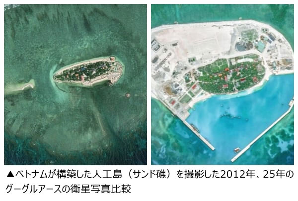 CSISの今年3月の報告書によると、ベトナムは2021年から南市中尾のスプラトリー諸島(中国名:南沙諸島)において岩礁や岩盤、サンゴ礁などを埋め立てて軍事的に強化された人工島を構築した。これらの島々は中国だけでなく台湾・フィリピン・マレーシア・ブルネイとも領有権が重なる地域に位置している。