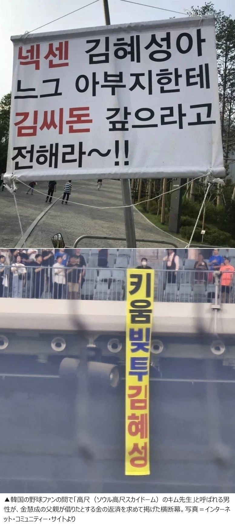 この男性は韓国の野球ファンの間で「高尺(ソウル高尺スカイドーム)のキム先生」と呼ばれている人物で、金慧成の父親に約1億ウォン(約1100万円)貸したと主張している人物だ。ソウル高尺スカイドームは金慧成が韓国で所属していたチームのホームスタジアムだ。数年前から金慧成が出場する試合のスタジアムに行き、「お前の父親にキム先生の金を返せと伝えろ」という内容の横断幕を掲げ、トラブルを起こしている。