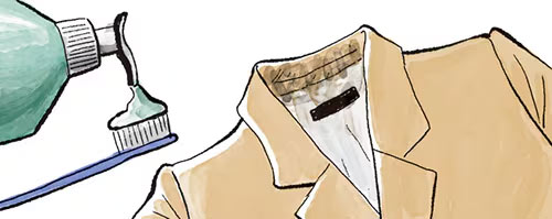 コートの襟汚れが落ちない時は、シャンプーを歯ブラシにつけて軽くこすってみると、シャンプーの中の脂肪分解成分が汚れを溶かしてきれいになる。