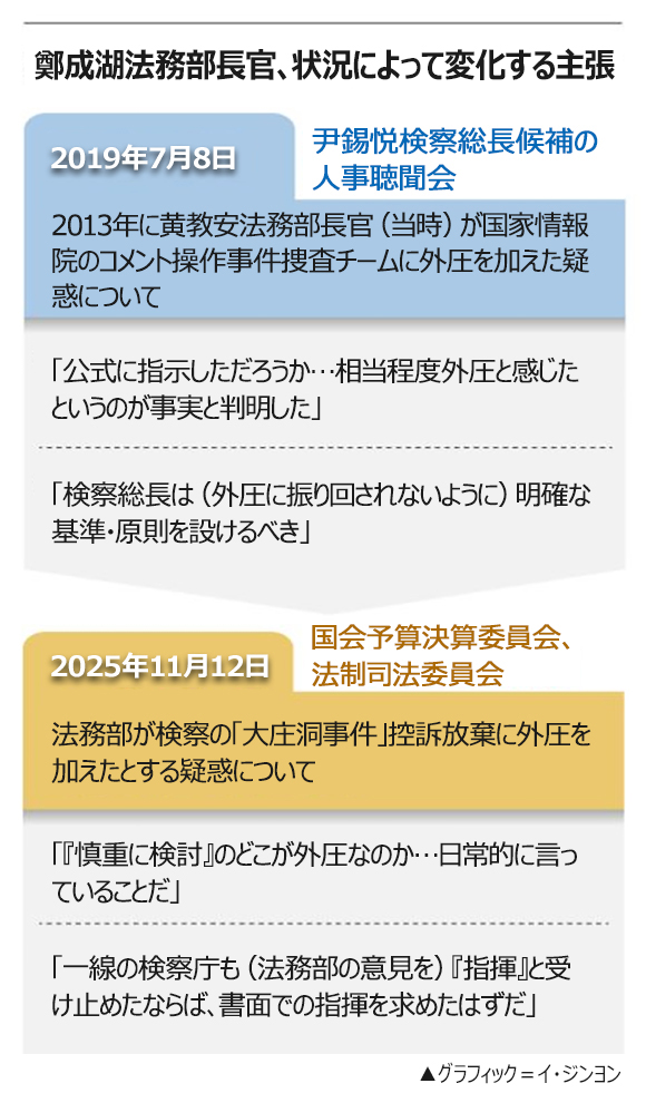 鄭長官は国会で民主党所属の法制司法委員だった2019年7月8日、尹錫悦(ユン・ソンニョル)検察総長候補(当時)の人事聴聞会で、「青瓦台(大統領室)や大統領の意思が法務部長官を通じて、または直接検察総長に伝えられ、事件を歪曲(わいきょく)し、実体的真実を変化させると国民の多くが疑っている」と発言した。