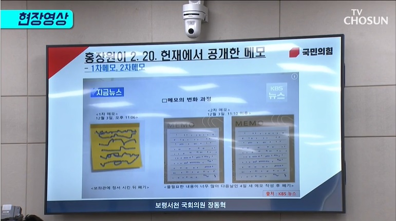 洪元次長は公判で、自身の行動が記録された国家情報院の監視カメラ映像が外部に公開されたことも問題視した。洪元次長は当時、メモを作成した時間と場所を「昨年12月3日午後11時6分、国家情報院長公館入口の空き地」と説明していたが、国民の力は今年2月、国家情報院を通じ、当時洪元次長が国情院本庁に入る姿が映った監視カメラ映像を入手し公開した。これについて、洪元次長は「監視カメラ映像はかなり編集された状態で偏向的に公開された」と主張した。