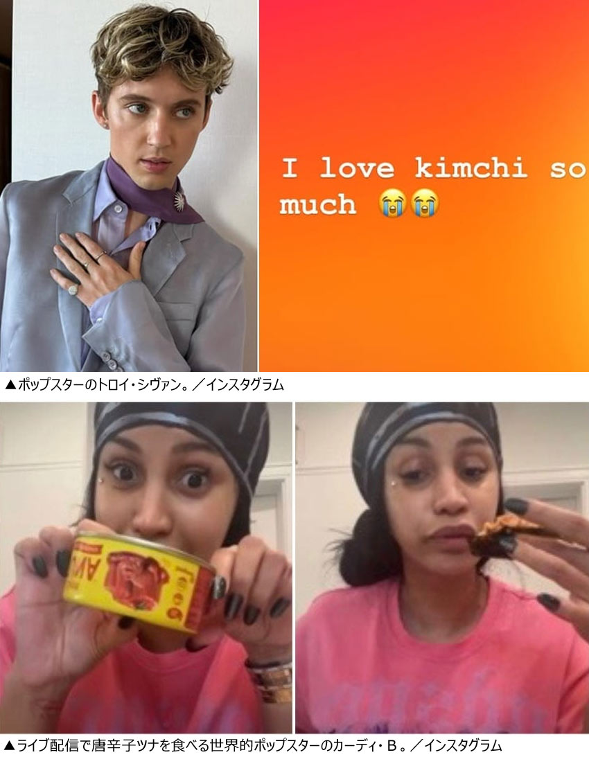 近ごろ世界的な韓流ブームの影響で、韓国の料理や食品を賞賛する海外スターが増えている。最近ではポップスターのカーディ・Bが韓国人向けスーパーで買ったという「コチュチャムチ(唐辛子ツナ)」とご飯を混ぜてのりで巻いて食べるという「モクパン」(食事のライブ配信)をして「韓国人はクレイジー。おいしすぎる」と叫び、世界的に話題になった。