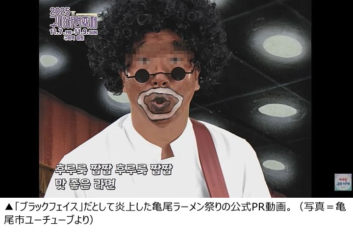 【NEWSIS】慶尚北道亀尾市が主催した「亀尾ラーメン祭り」の公式PR動画が、黒人を侮辱する「ブラックフェイス(黒人でない人が黒人を演じるために肌を黒く塗るメーク)」の俳優が登場しているとして物議を醸している。