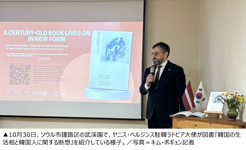 ▲駐韓ラトビア大使館は10月30日、ソウル市鍾路区の武渓園で、1899年にラトビアで初版が発行された図書『韓国の生活相と韓国人に関する断想』の初のハングル翻訳版を公開した。/写真=キム・ボギョン記者