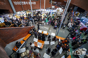 【NEWSIS】18日、ソウル市中区の広蔵市場で開かれた「2025 seoul vibe」で、演奏者たちがK-POPの楽曲公演を行っているところ。