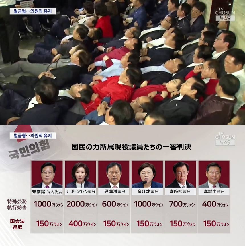 裁判所は宋彦錫(ソン・オンソク)院内代表とナ・ギョンウォン議員、尹漢洪(ユン・ハンホン)議員、金汀才(キム・ジョンジェ)議員、李晩熙(イ・マンヒ)議員、李喆圭(イ・チョルギュ)議員の現職議員6人全員にこれを下回る罰金刑を下しました。