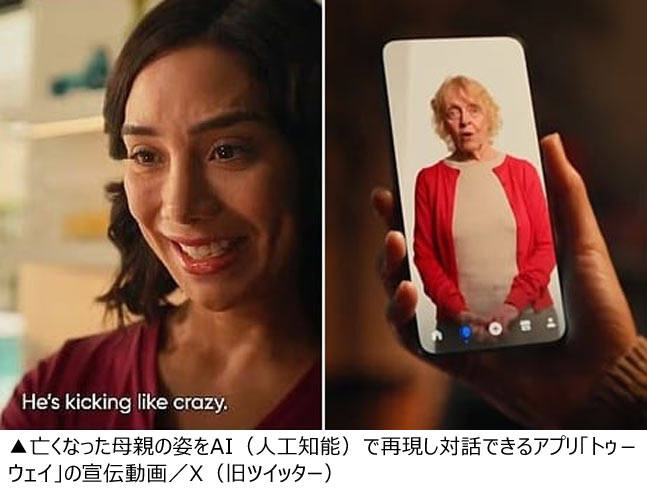 動画には妊婦がツーウェイのアプリを使い、亡くなった母を再現したAIと対話する様子が映し出されていた。