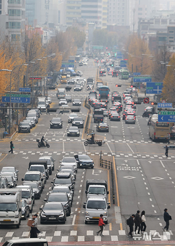 【NEWSIS】ソウルのPM10およびPM2.5濃度が「悪い」の水準となった25日、ソウル市中区の東湖路から望むソウル都心は白くかすんでいた。
