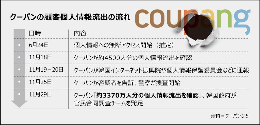 クーパンは11月29日「3370万人分の顧客個人情報流出を確認した」と発表した。クーパンは11月18日にも約4500人分の顧客情報流出を確認したが、被害者の数はわずか11日で7500倍に拡大した。クーパンの初動対応が事実上の隠蔽(いんぺい)に近かったとの批判も避けられなくなった。