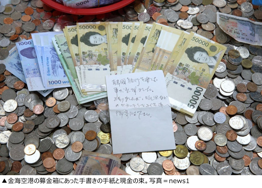 日本人旅行客と推定される匿名の寄付者が空港の募金箱に現金110万ウォン(約12万円)と手書きのメッセージを残して行き、韓国で話題になっている。大韓赤十字社釜山支社が1日に明らかにした。