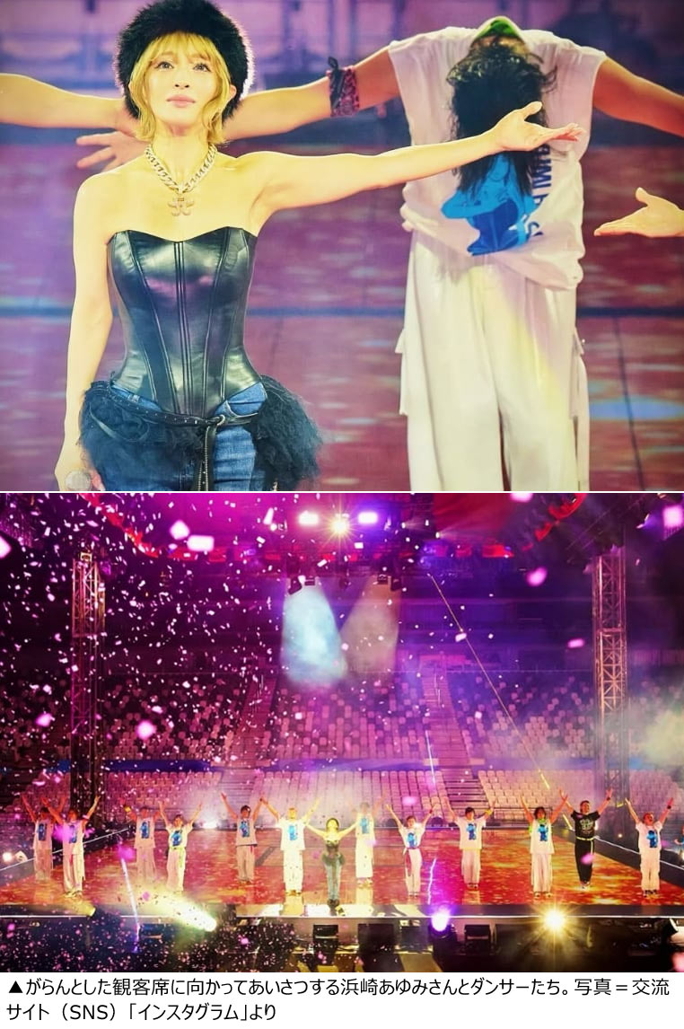 写真を見ると、浜崎あゆみさんはダンサーたちと一緒にステージに立ち、客席に向かって手を振りながら情熱的な公演をしている。華やかなステージ衣装にライト、紙吹雪などがすべてそのまま使われている。ステージが終わった後、バックダンサーたちが頭を深く下げてあいさつする姿も写っていた。しかし、観客席はがらんとしていた。無観客公演を行ったのだ。