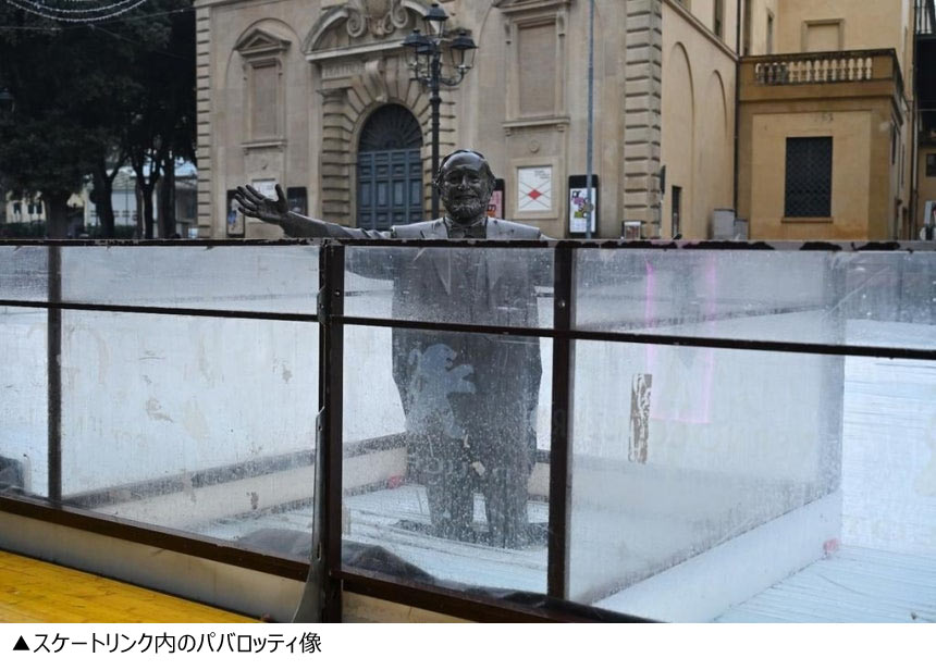 イタリアの世界的テノール歌手「ルチアーノ・パバロッティ」の銅像が工事の事情でスケートリンクの中に残され話題になっている。遺族は「故人に敬意を欠く」として怒りをあらわにしている。