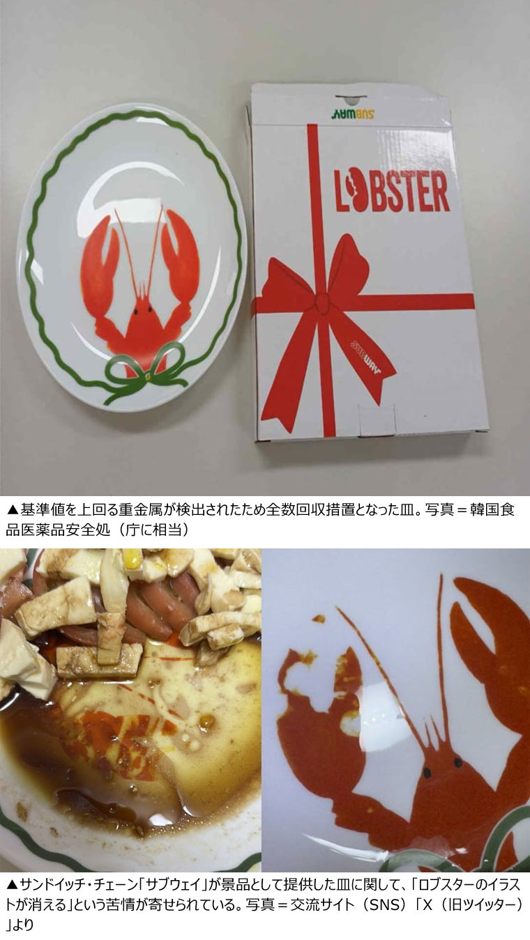 サンドイッチ・チェーン「サブウェイ」が景品として提供した「ロブスターのイラスト入り皿」から基準値を上回る重金属が検出されたのを受け、韓国食品医薬品安全処(庁に相当)が回収措置を取った。サブウェイ側は謝罪文を正式発表し、補償手続きに着手した。