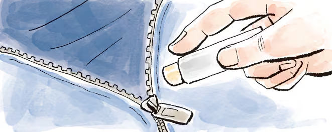 ファスナーの滑りが悪い時は、リップクリームをファスナーの歯の部分に少し塗ると、リップクリームのオイル成分が潤滑油の役割をしてファスナーがスムーズに動くようになる。
