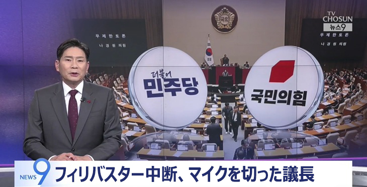 100日間の定期国会の最終日の9日、これまでなかった状況がまたも繰り広げられました。保守系野党「国民の力」は内乱裁判部設置法案など8大悪法撤回を要求しましたが、進歩(革新)系与党「共に民主党」が受け入れないことから、非争点法案についても無制限討論、「フィリバスター」に突入しました。ところが禹元植(ウ・ウォンシク)国会議長が途中で停会を宣言したのです。「議題とは無関係な討論をしている」という理由を挙げたのですが、今の状況がどういうものなのか、国会取材記者とつなげて調べてみたいと思います。ピョン・ジョンヒョン記者、フィリバスターがきちんとできないんですか?