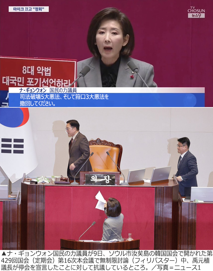 先に禹元植・国会議長は、与野党の対峙(たいじ)で騒然となるや「これ以上進めることはできない」として停会を宣言し、フィリバスターは2時間ほど中断されました。