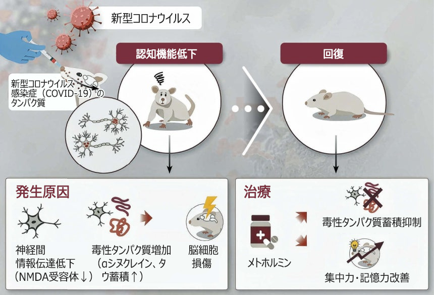 ネズミのこのような変化は、新型コロナウイルスのS1タンパク質が脳に到達し、神経細胞間の連結(シナプス)機能を妨害し、「NMDA受容体」遺伝子の発現を減少させるためと分析されている。NMDA受容体は脳で神経細胞間の信号伝達と記憶形成に重要な役割をする。S1は血液および脳組織に感染後数カ月以上存在する可能性があり、神経細胞機能の低下および退行性変化を誘発する可能性が提起されていた。
