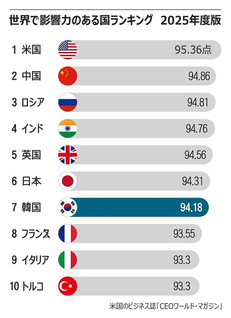 米国メディアによる「世界で影響力のある国ランキング」2025年度版で韓国はフランスを抑え7位に入った。