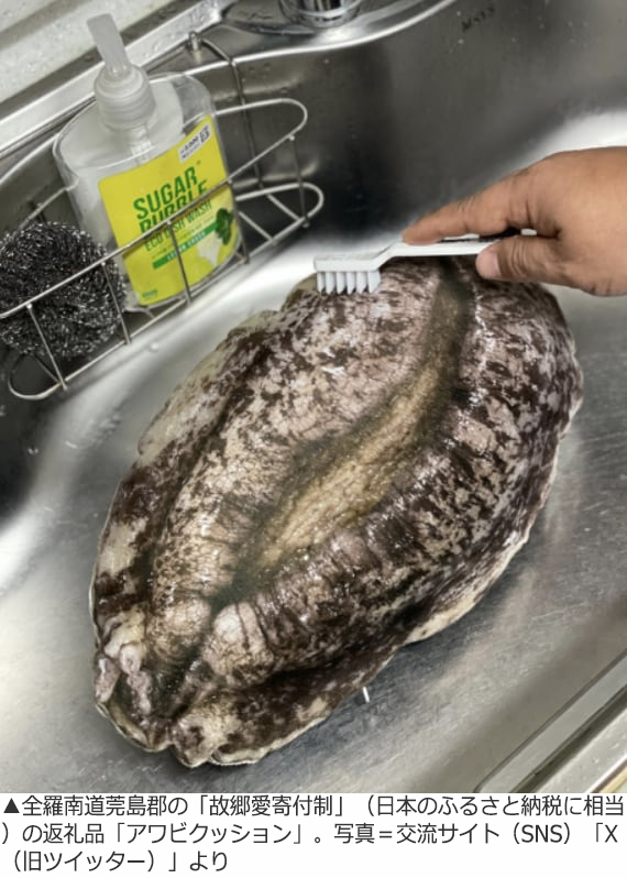 10日、交流サイト(SNS)「X(旧ツイッター)」に「『故郷愛寄付制』を通じて全羅南道莞島郡に寄付し、返礼品としてアワビクッションをもらった」という投稿があった。投稿者は「思ったよりリアルだ」と書いて写真を掲載した。写真のクッションは本物のアワビと区別がつかないほどリアルな見た目で、注目を集めている。