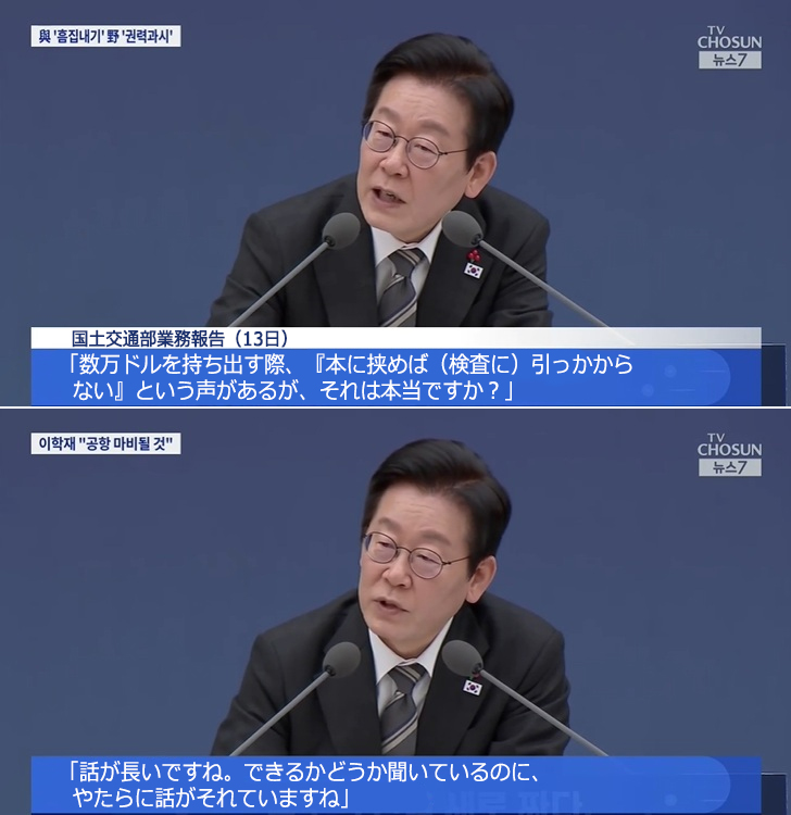 テレビで生中継されていた韓国の部処(省庁)別業務報告で、李在明(イ・ジェミョン)大統領の複数の発言が波紋を呼んでいます。李大統領は「ドル紙幣をしおりのように本に挟んで違法に外貨を持ち出したケースなどがある」として、そうした外貨の違法持ち出しを検査する方法を問いただしました。李大統領から公の場で叱責(しっせき)された仁川国際空港公社の李鶴宰(イ・ハクチェ)社長は事実上の反論に当たる見解文を交流サイト(SNS)上に掲載しました。しかも、李大統領が提示した方法通りにすれば空港がマヒするだろう、と言い返しました。今週も業務報告が続きますが、同様の状況が繰り返されるのではないかと思われます。コ・スンヨン記者がお伝えします。