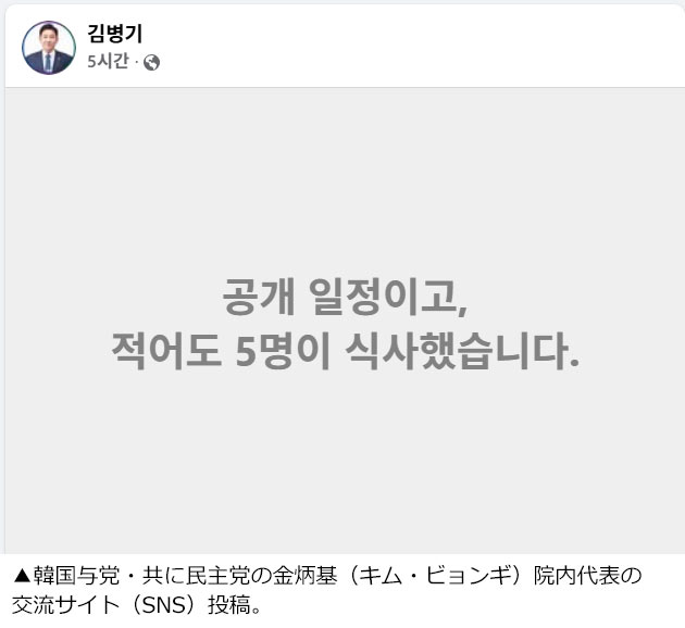 韓国与党・共に民主党の金炳基(キム・ビョンギ)院内代表(国対委員長に相当)が今年の国政監査前、ネット通販最大手「クーパン」の代表=当時=らとソウル・汝矣島にあるホテルで1人当たり約23万ウォン(約2万4000円)相当の昼食をしたという疑惑について、「(情報)公開(していた)日程だった。少なくとも5人以上が食事をした」と16日に釈明した。