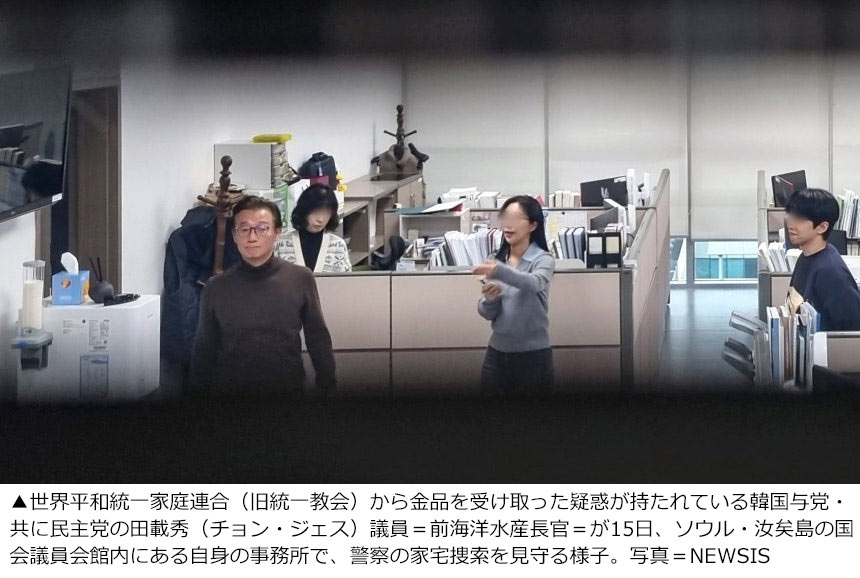 【週刊朝鮮】世界平和統一家庭連合(旧統一教会)から金品を受け取った疑惑が持たれている韓国与党・共に民主党の田載秀(チョン・ジェス)議員=前海洋水産長官=の自宅と国会議員室を検察が家宅捜索する過程で、立会人手続きの問題により捜索が2時間以上遅れたことが分かった。