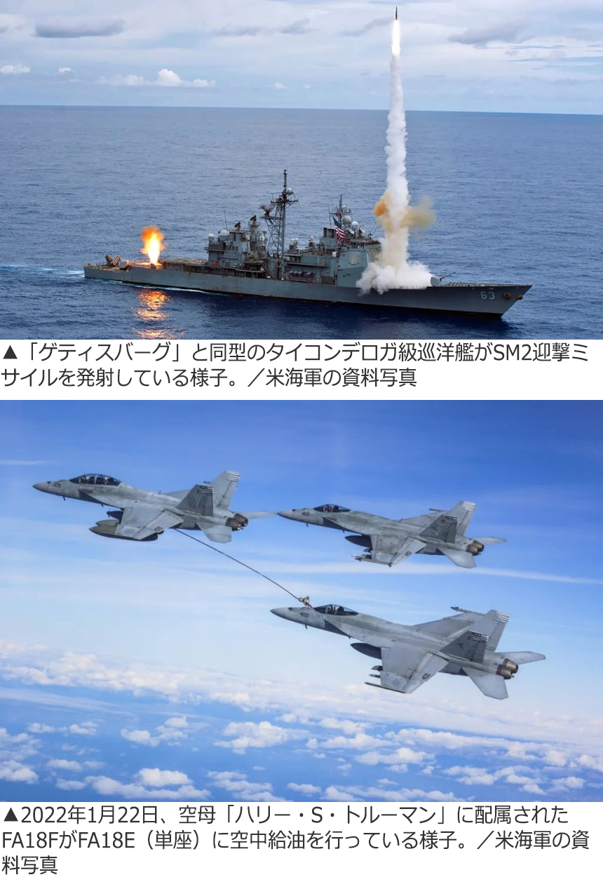 現地時間の午前2時ごろ、空母に着艦するためアプローチしていたFA18Fスーパーホーネットのパイロットは、キャノピー(操縦席の天蓋〈てんがい〉)外でミサイル巡洋艦ゲティスバーグの発射したスタンダード・ミサイル2(SM2)が空に向かって上昇するのを見た。SM2は敵航空機や対艦ミサイルを迎撃する、米海軍の中・長距離ミサイルだ。韓国海軍の「世宗大王」級イージス駆逐艦にもSM2が搭載されている。