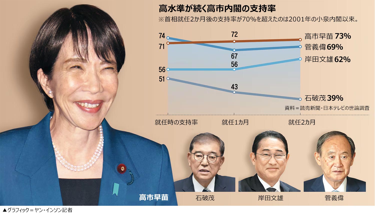 読売新聞が22日に発表した世論調査で、高市内閣の支持率は発足当初より2ポイント高い73%だった。石破茂前首相の同じ時点での内閣支持率(39%)に比べると34ポイントも高い数値だ。読売新聞が世論調査を定例化した1978年以来、就任2カ月目で70%以上を記録したのは細川内閣(1993年)、小泉内閣(2001年)と今回の高市内閣だけだ。日経新聞の調査でも、高市内閣の支持率は75%で前月と同じだった。また毎日新聞の調査では前月より2ポイント上昇の65%を記録した。朝日新聞は、「『ハネムーン』が終われば支持率が下落するのが一般的だが、高市内閣の支持率は高水準を維持している」と指摘した。