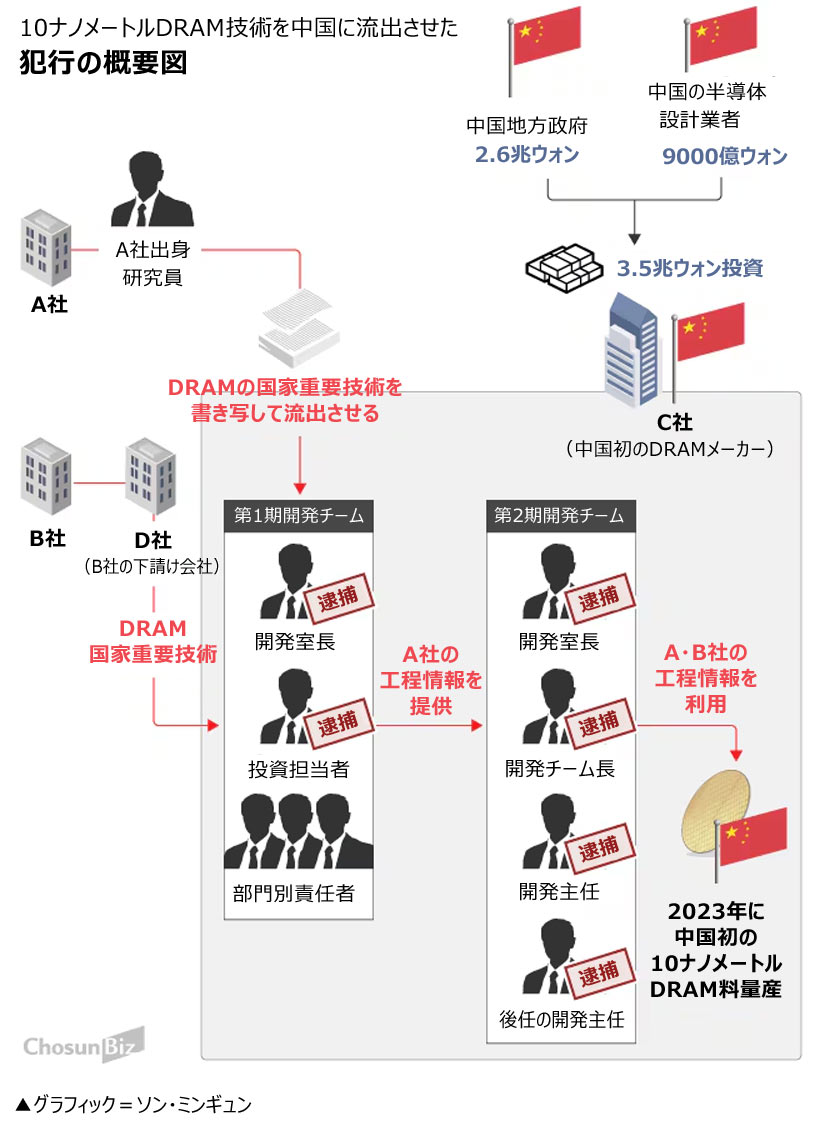 検察は元役員のA容疑者がサムスン電子から中国半導体メーカーである長鑫存儲技術(CXMT)に転職した2016年からサムスン電子の重要な半導体技術が中国に流出したことをつかみ、昨年1月に捜査に着手した。サムスン電子の元研究員B容疑者は16年9月、CXMTに転職し、サムスン電子の10ナノメートルレベルのDRAM工程に関する情報を紙12枚に書き写す方式で持ち出した疑い。B容疑者はコンピューターからファイルをコピーしたり、携帯電話で撮影したりすれば摘発されると考え、約600段階に達するDRAM製造工程と設備に関する情報を書き移したとされる。B容疑者が書き写した情報は、サムスン電子が5年間で約1兆6000億ウォン(約1700億円)を投資し、世界で初めて開発した重要技術だった。