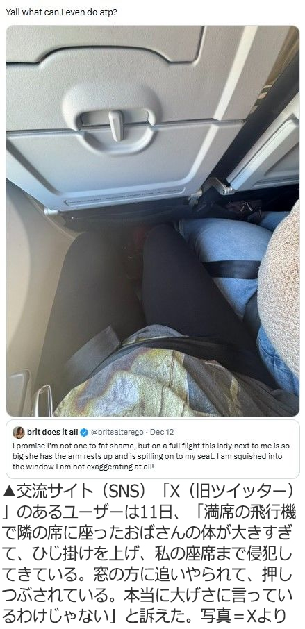 投稿者は「満席の飛行機で隣の席に座ったおばさんの体が大きすぎて、ひじ掛けを上げ、私の座席まで侵犯してきている。窓の方に追いやられて、押しつぶされている。本当に大げさに言っているわけじゃない」と訴えた。