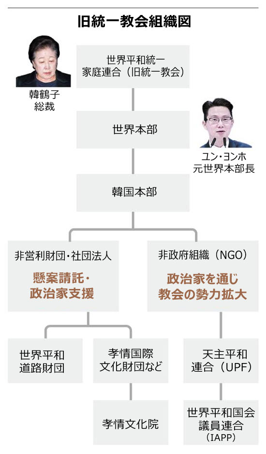 旧統一教会は関連機関としてNGOを作り、政治家と交流するルートとして利用した。2005年に設立されたUPFは南北統一や平和問題に関して国内外で活動を行う団体だ。旧統一教会は同団体について、「国連経済社会理事会で『包括的協議地位』を得るなど、世界的に公信力のある団体だ」と主張している。しかし、UPFも政治家を動員して同教会の勢力を拡張する手段になった。ユン・ヨンホ元世界本部長が2022年韓国大統領選挙を前に与野党の政治家と接触を試みた「ワールド・サミット」もUPFが主管する催しだった。