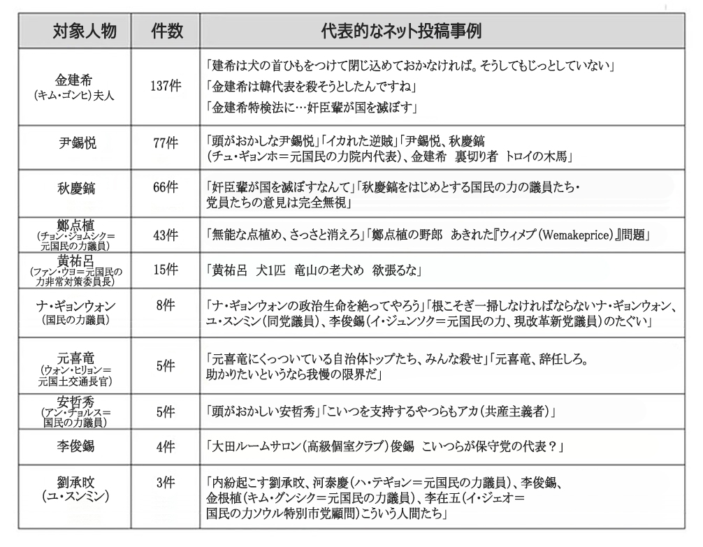 【表】尹大統領夫妻のみならず国民の力所属の大物議員たちにも浴びせられた罵詈雑言の例