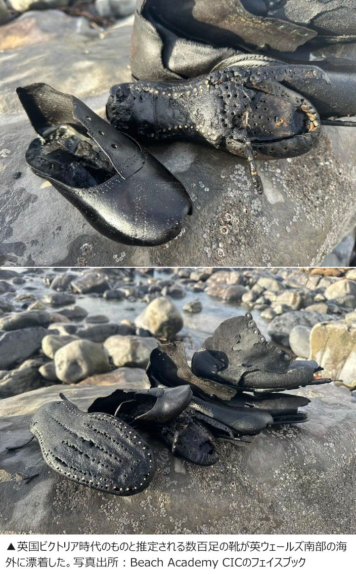 【NEWSIS】英ウェールズ南部の海岸でビクトリア時代(1837-1901)のものと推定される数百足の靴が発見され話題になっている。