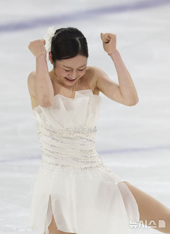 【NEWSIS】4日、ソウル市陽川区の木洞アイスリンクで、第80回全国男女フィギュアスケート総合選手権大会兼2026ミラノ・コルティナダンペッツォ冬季五輪韓国代表第2次選抜戦が行われた。写真は女子シングル・フリーの演技を終え、ポーズをする辛智娥(シン・ジア)=世和女子高=。