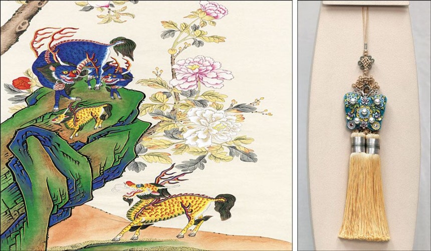 ▲中国を国賓訪問中の李在明(イ・ジェミョン)大統領は5日、習近平国家主席夫妻に「麒麟(きりん)図」を贈った。絵の中の麒麟は天下太平と子孫繁栄の象徴だ。右の写真は七宝のイ・スギョン名人が製作した「探花ノリゲ」。花を探して羽ばたくチョウの姿を七宝技法で表現した作品だ。写真=青瓦台(韓国大統領府)