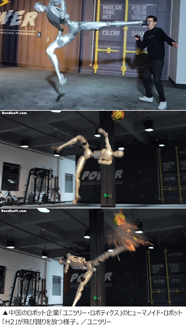 さらに、H2が助走を付けて飛び蹴りする場面では、ユニツリーの創業者で最高経営責任者(CEO)のワン・シンシン(王興興)さんが驚いて後ずさりする様子も捉えられていた。