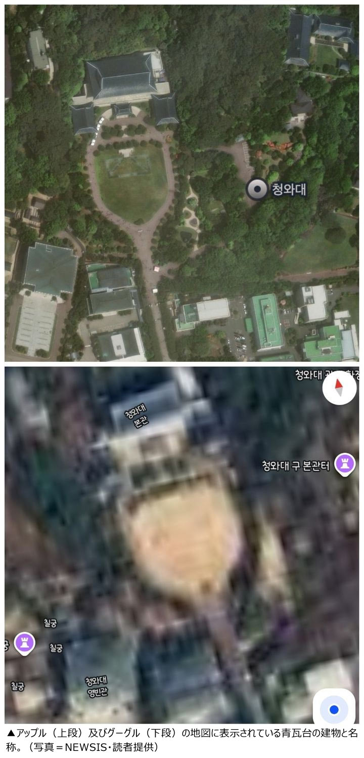 青瓦台の関係者はこの日、「グーグルとアップルが運営する地図サービスに、青瓦台の建物の衛星写真や名称が表示されている」というNEWSIS側の指摘に対し「国土交通部を通じて速やかに対応する予定」と説明した。別の青瓦台高官は「国土地理情報院がアップル側に是正を要求中」と述べた。