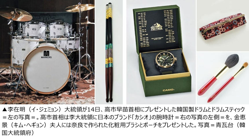 【写真】韓日首脳会談 贈呈品のドラムセット・腕時計