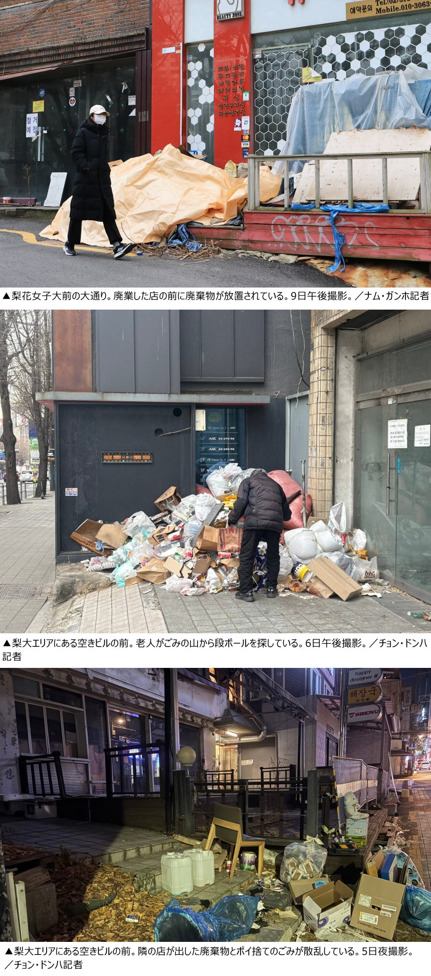 明洞、狎鴎亭洞と共に、ソウルの「3大黄金商圏」と呼ばれていた新村・梨大エリアのメインストリート沿いが、「ごみ置き場」と化している。新村・梨大エリアの商圏は、2008年に梨花女子大が構内に映画館・コンビニ・飲食店の入るマルチプレックスを造成し、2010年に延世大が新入生全員を仁川・松島の国際キャンパスに移して以降、衰退し始めた。ここ数年、ネット注文・デリバリー文化の急速な広がりによって消費トレンドが大きく変化したが、その流れに対応できなかったことが打撃となった。