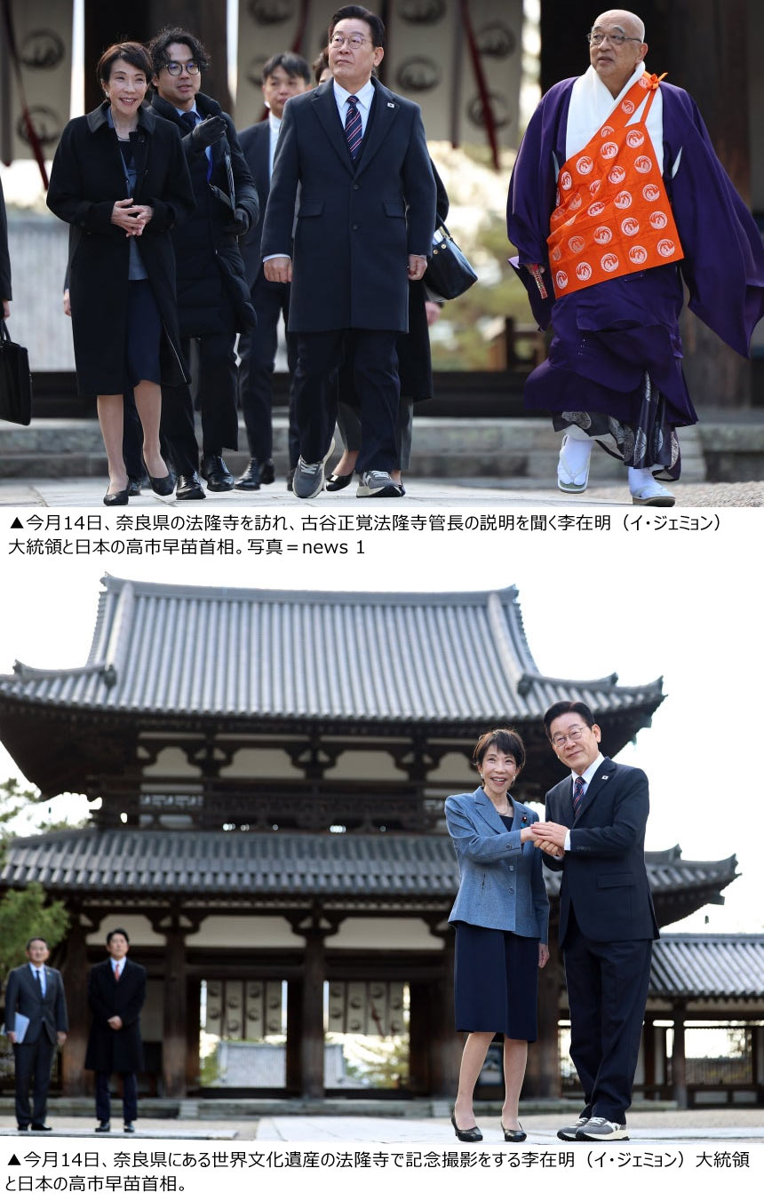 李大統領は訪日2日目の今月14日、日本の高市早苗首相と共に奈良県にある世界文化遺産の法隆寺を訪れた。