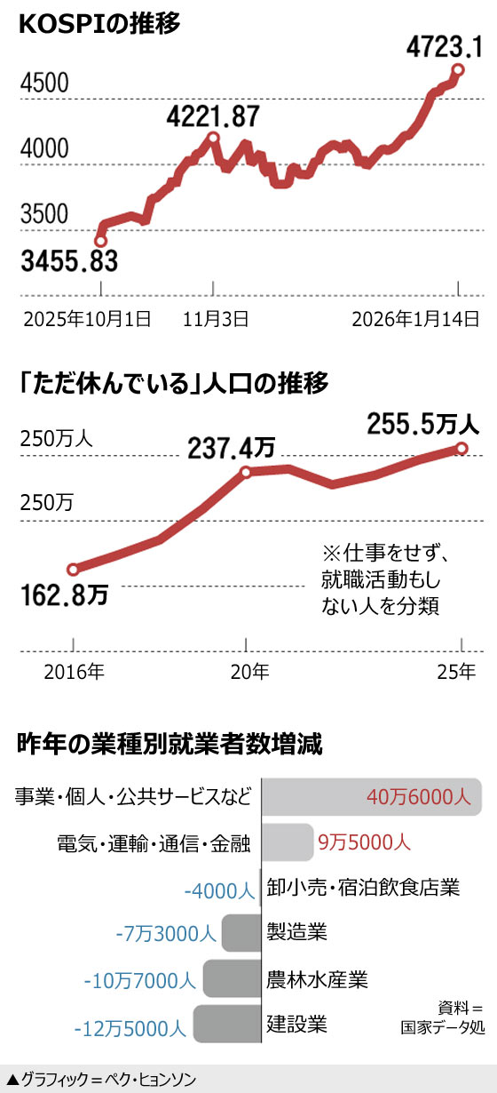韓国総合株価指数(KOSPI)が14日、初めて4700に乗せるなど、連日過去最高値を更新している。しかし、建設業と製造業の不振が重なり、雇用市場には「寒波」が押し寄せている。昨年12月の失業者数は12月としては過去最多を記録し、失業率も2000年以来25年ぶりの高さを記録した。成均館大国政専門大学院のキム・ドクホ兼任教授は「KOSPIなど金融市場の活気と雇用市場の冷え込みが好対照なのは、韓国経済の『二重構造』を反映しているからだ」とし、「半導体・自動車のような先端産業中心のグローバル企業はウォン安ドル高による恩恵と人工知能(AI)特需で好景気に沸いているが、鉄鋼・化学など従来型の製造業は中国との競争で押され、雇用創出力を失うという二極化が深まっている」と話した。